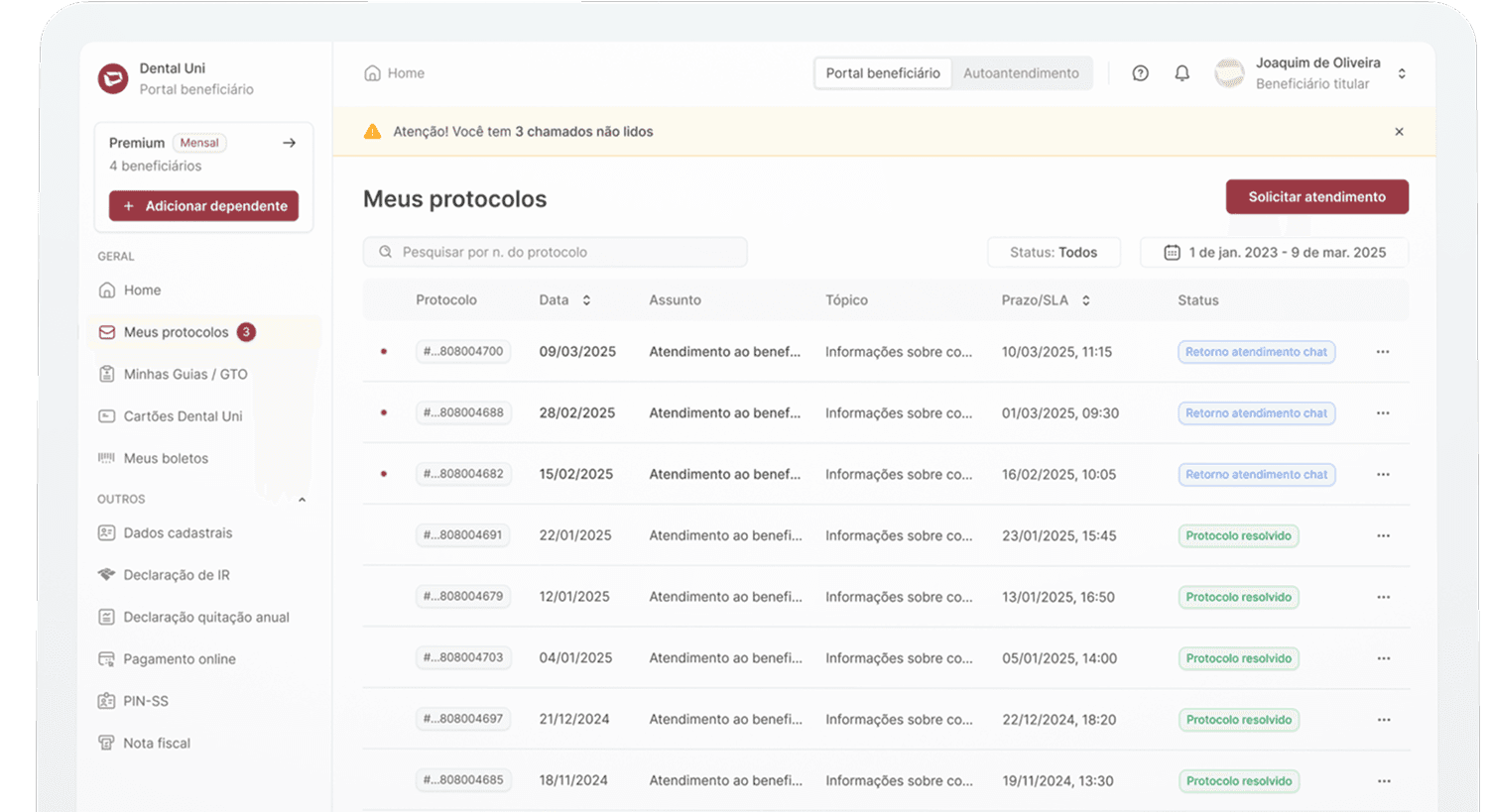 1. Baixe o aplicativo gratuito para beneficiários Dental Uni, 2. faça o login e 3. clique em Meus protocolos.